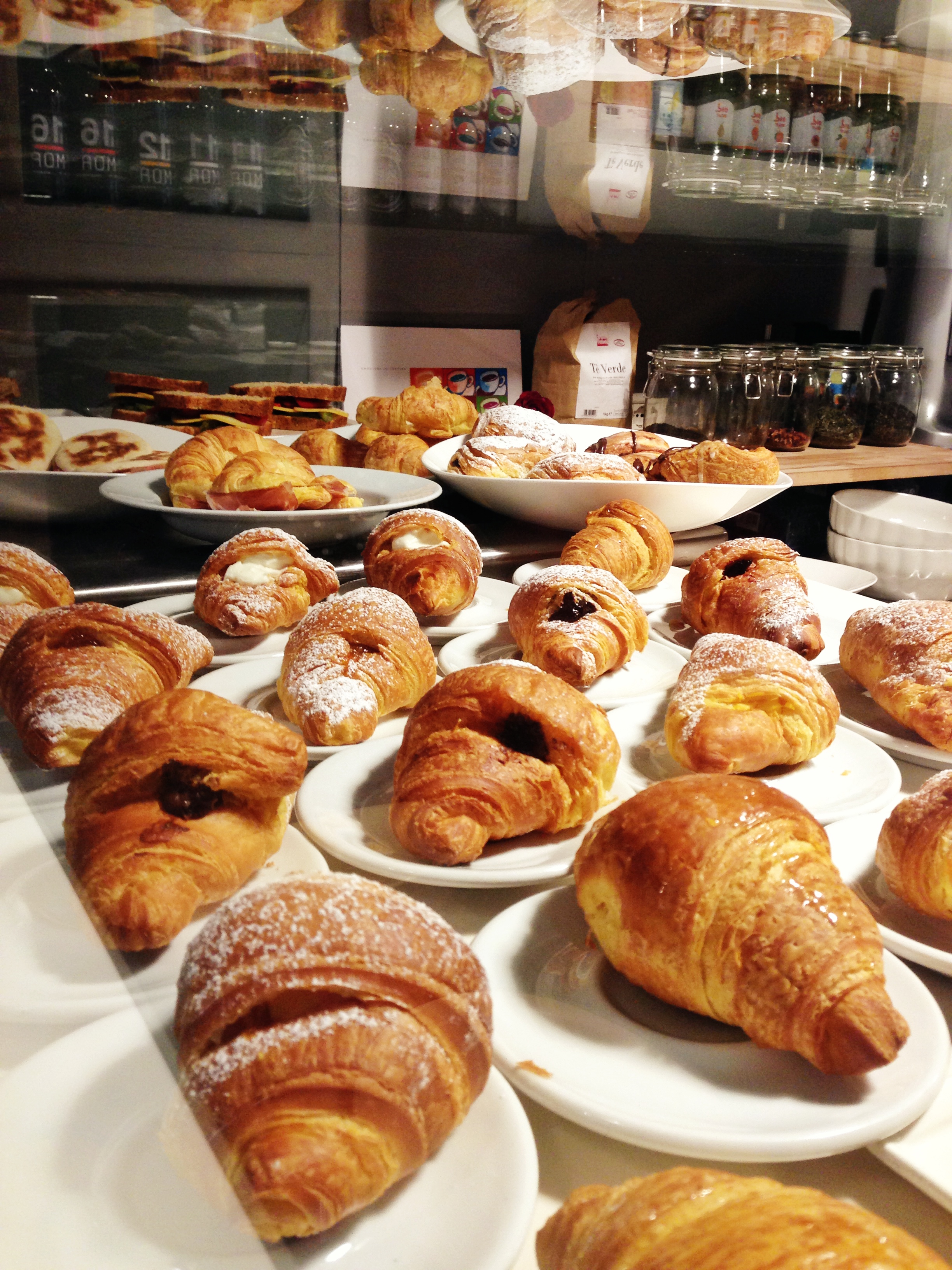 Pois bem, como já comentei por aqui, o café da manhã típico italiano é um cappuccino – ou café expresso – e una brioche (que é no feminino, mas é nosso croissant, também conhecido em algumas regiões da Itália como cornetto), salgada ou doce, com ou sem recheio – os clássicos: Nutella, creme, ou geléia.