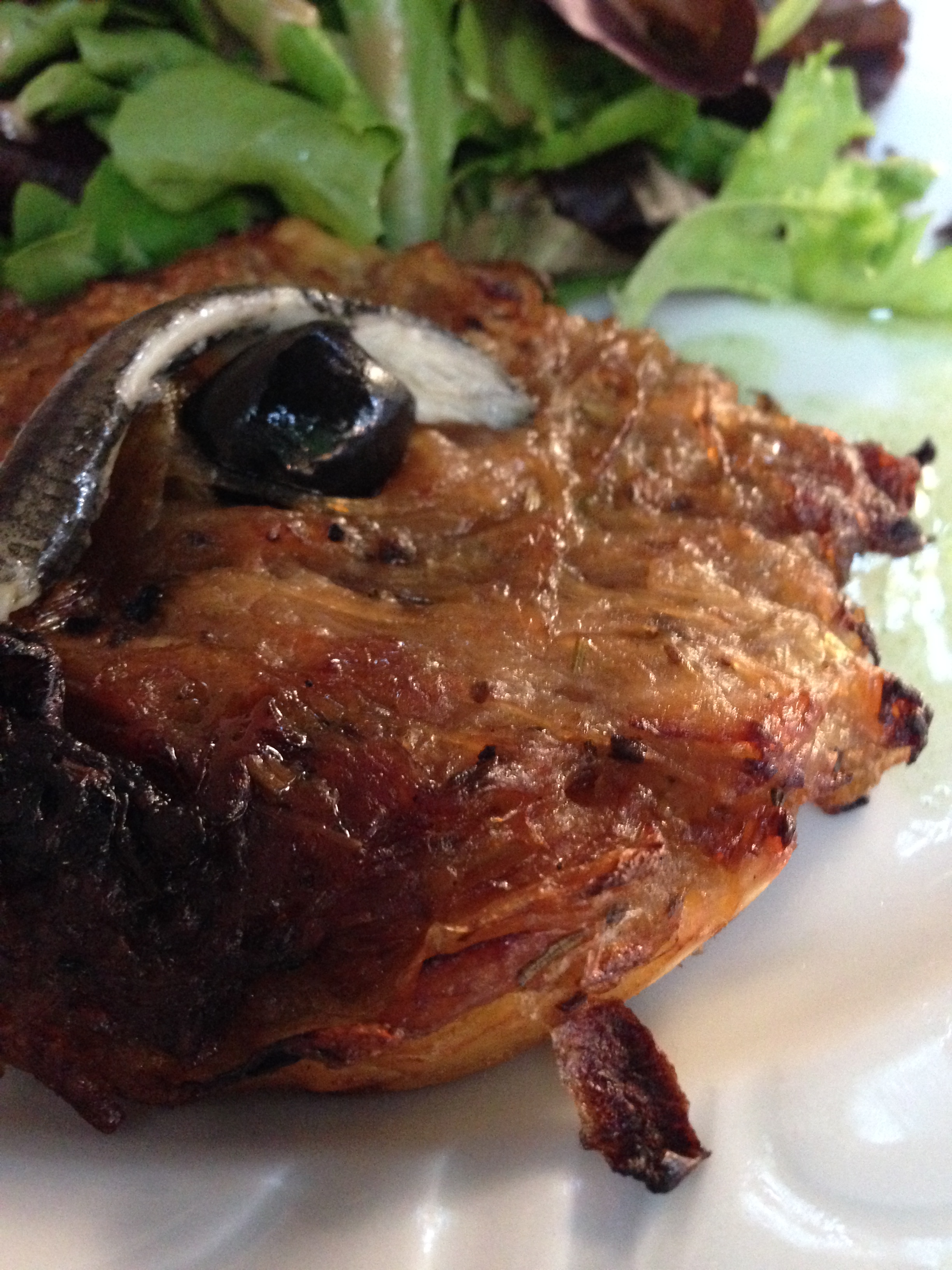 A massa é a um só tempo macia e consistente; não é fofa, mas mais pesadona, graças ao azeite que é misturado a farinha, água e fermento. O recheio, por sua vez, é composto de cebolas dulcíssimas, cozidas por quase uma hora com um pouco de açúcar e ervas da Provença, particularmente timo e louro. Basta dizer que o contraste com e o salgado dos filezinhos de alici e as azeitonas espalhados por cima funciona divinamente. É um sabor simples e equilibrado; tipo comida da avó.