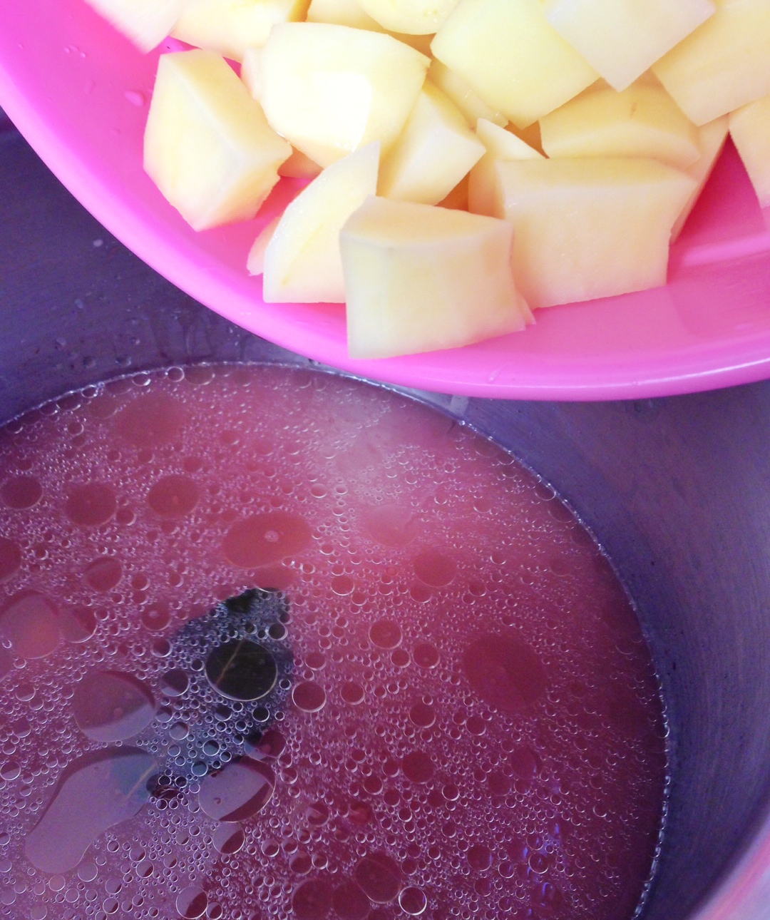 10) Faça a água ferver e jogue as batatas. Elas devem cozinhar ali pro aproximadamente 15 min ou até ficarem macias, mas não muito moles.