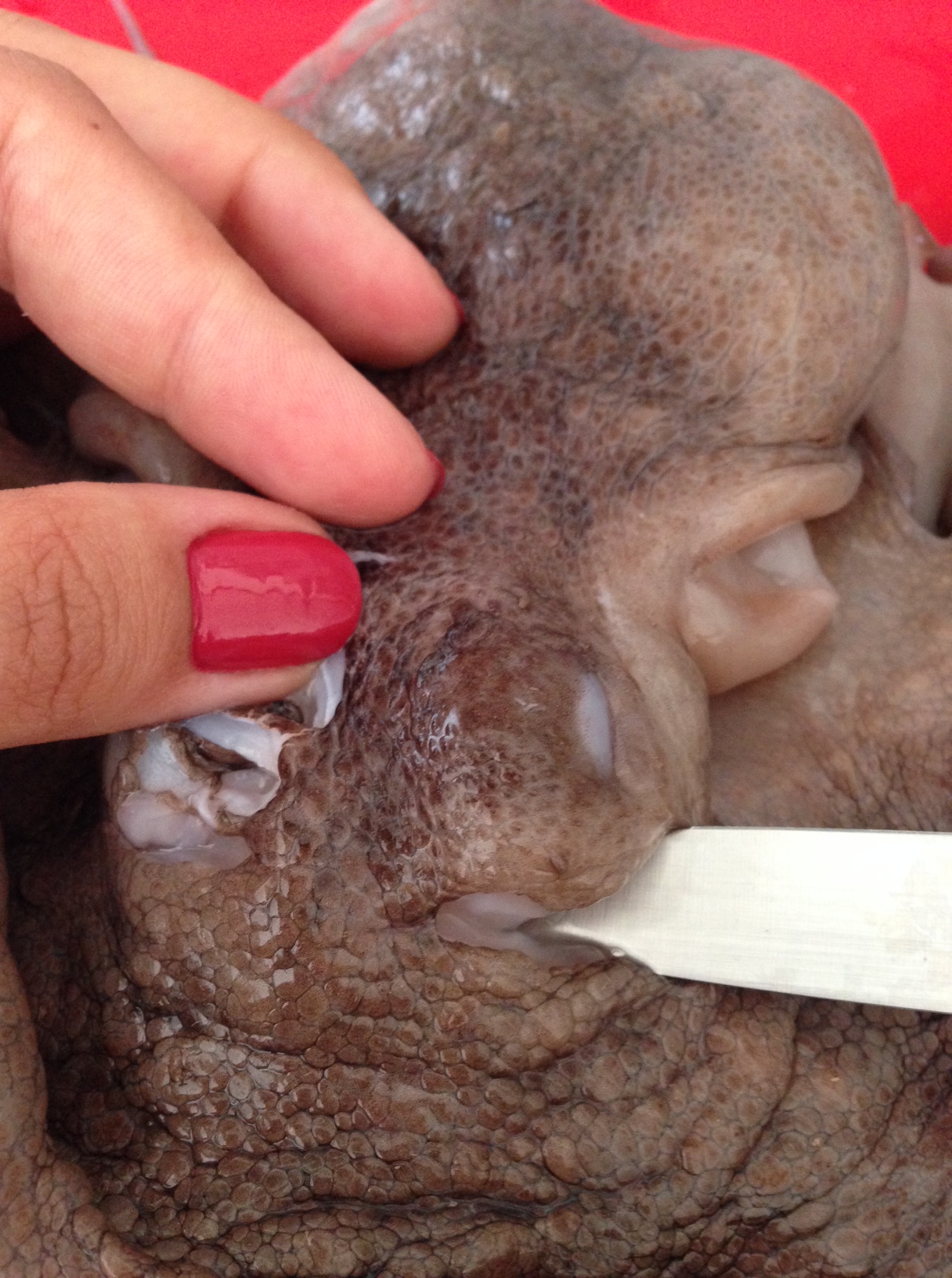 3) Agora, é a vez dos olhos. O procedimento é mais ou menos igual: deve-se fazer uma incisão embaixo e espremer um pouco para que todo o glóbulo ocular sair. Eu sei, não é para quem tem estômago fraco, mas juro que é divertido. Uma observação: pode ser que o olho se rompa quando você o estiver tentando tirar… não tem problema, mais uma vez o importante é limpar tudo, sob água corrente.