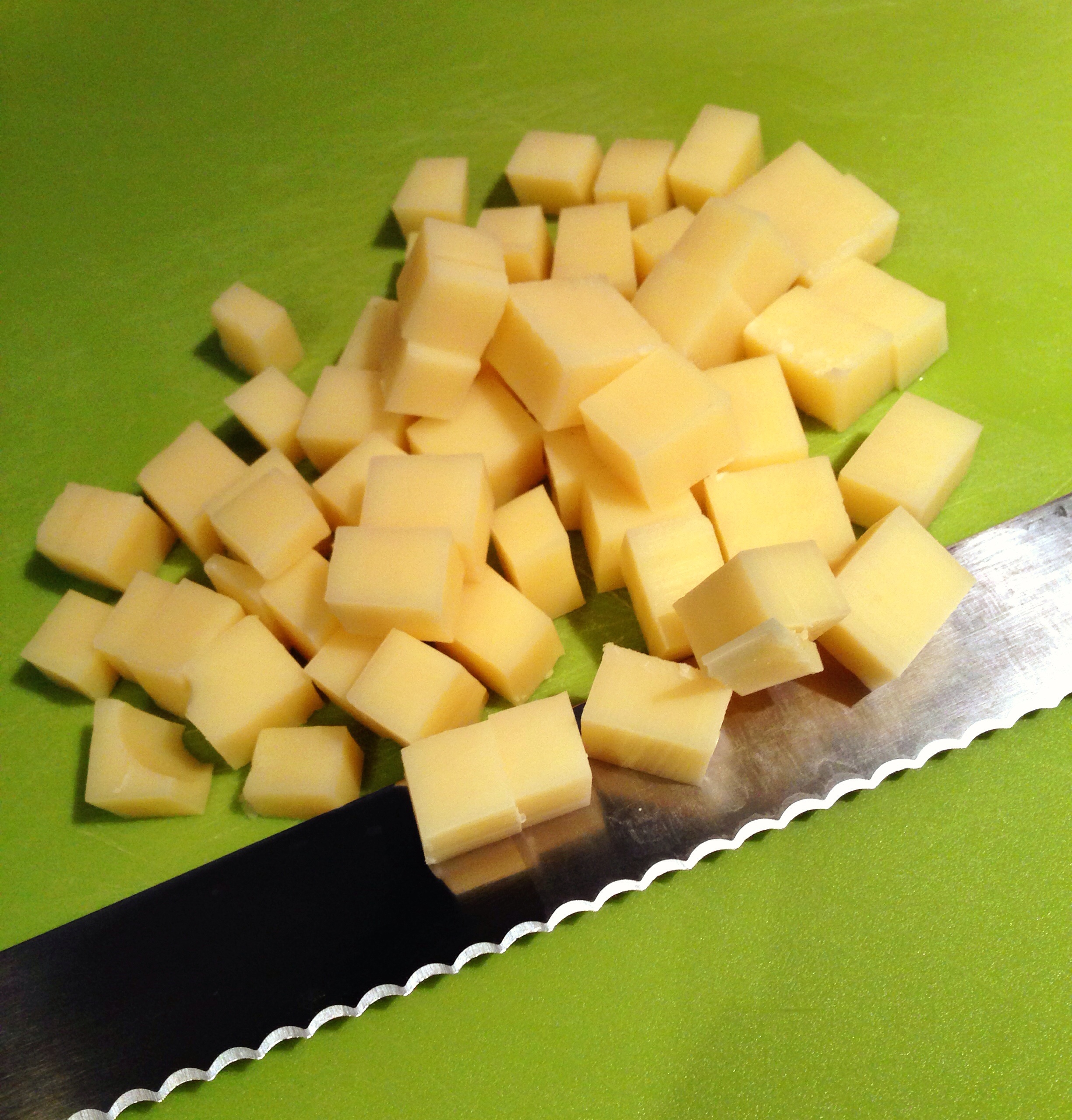 7) No meio tempo, corte o queijo em cubinhos pequenos. Reserve.