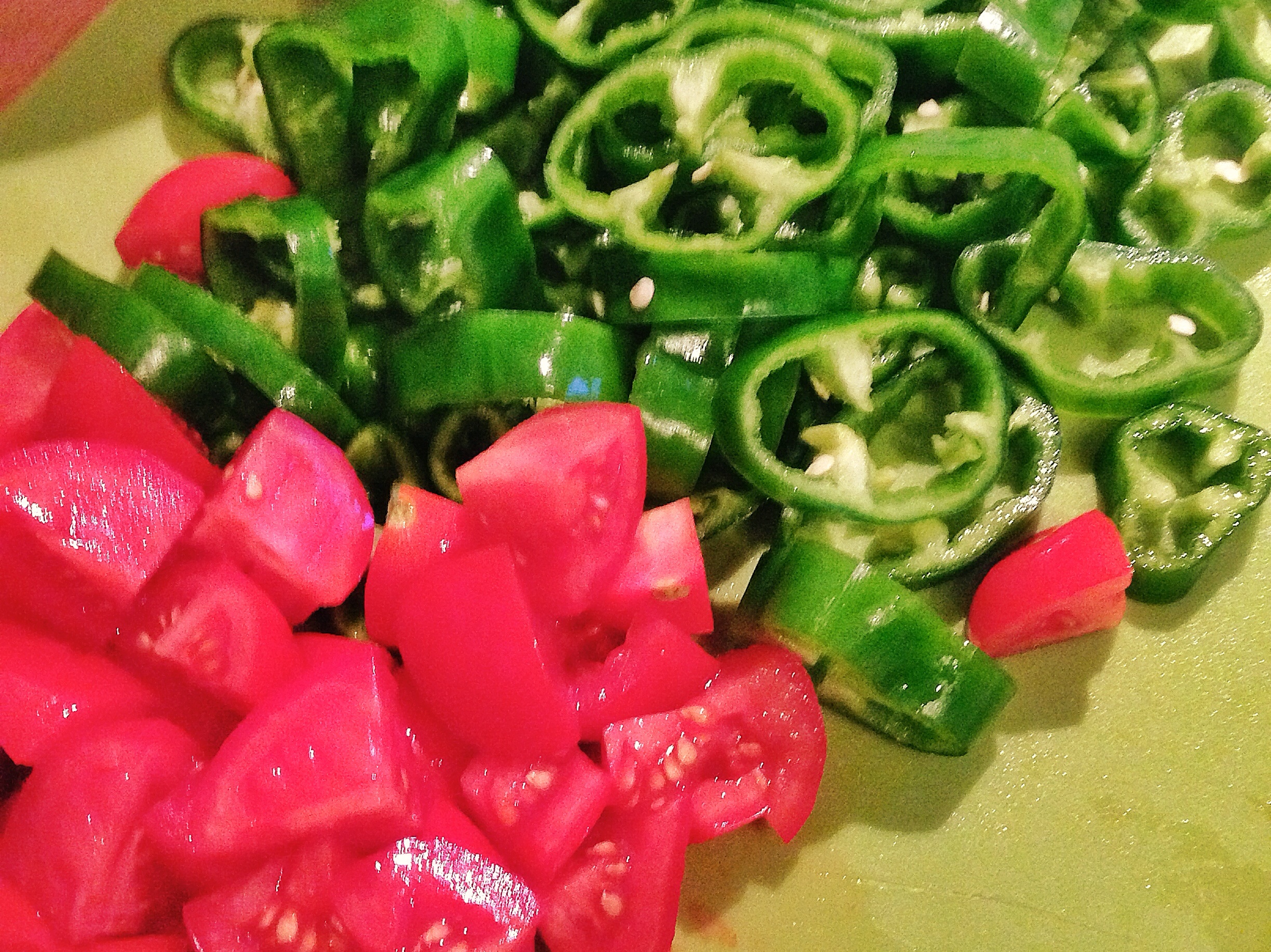 Hoje, a frittata é de friggitelli (a pimenta doce verde da qual já falei por aqui), tomates e queijo tipo emmenthal, mas você pode fazer com basicamente qualquer legume – e o queijo, que confere personalidade, pode ser qualquer um que derreta bem (e.g. queijo minas, brie, taleggio, e até mesmo queijo tipo parmesão ralado).