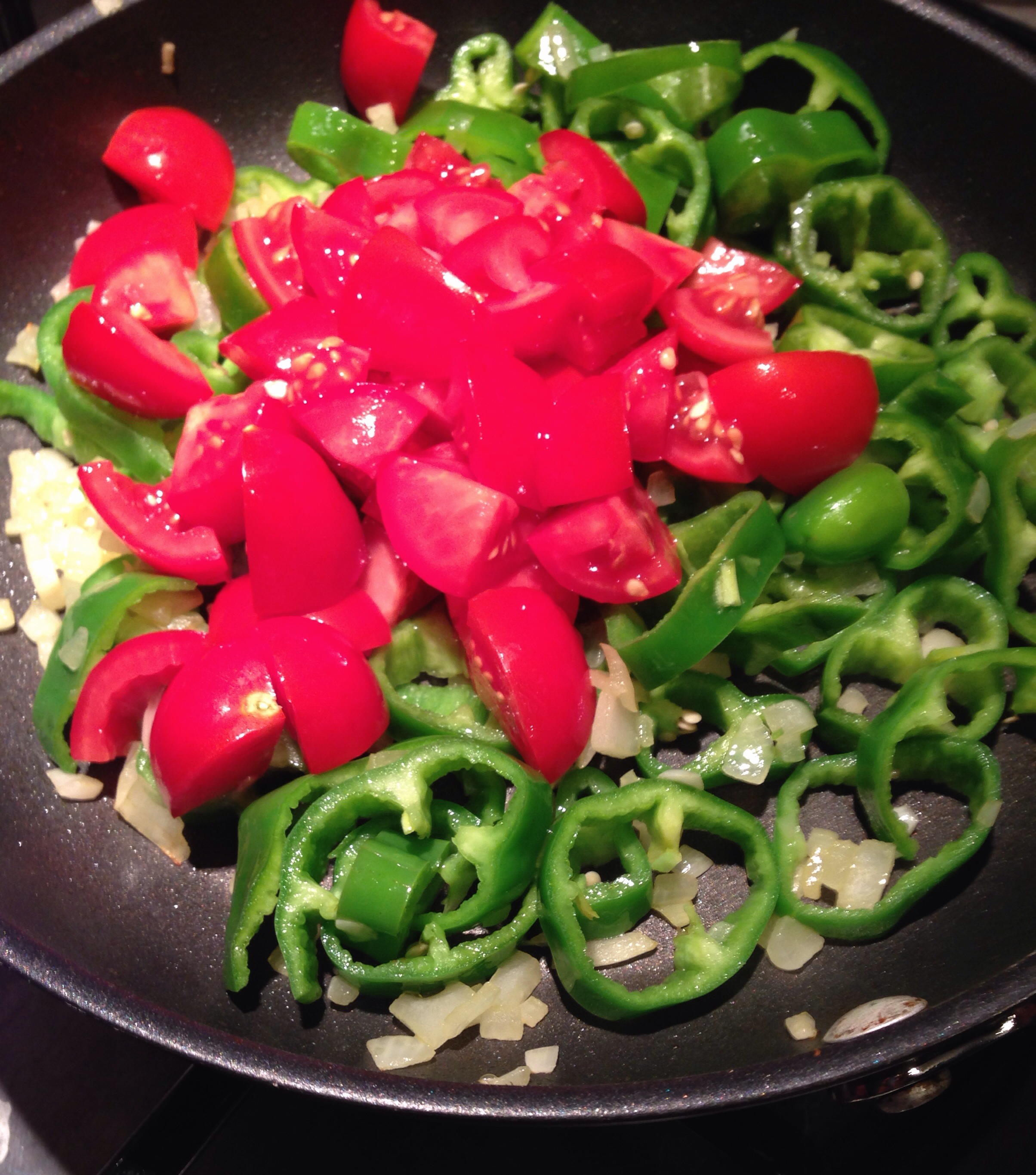 5) Quando as cebolas estiverem transparentes, aumente um pouco o fogo e coloque os friggitelli. Salteie-os por aproximadamente 5 minutos (cuidado para não queimar a cebola!) e adicione os tomates.