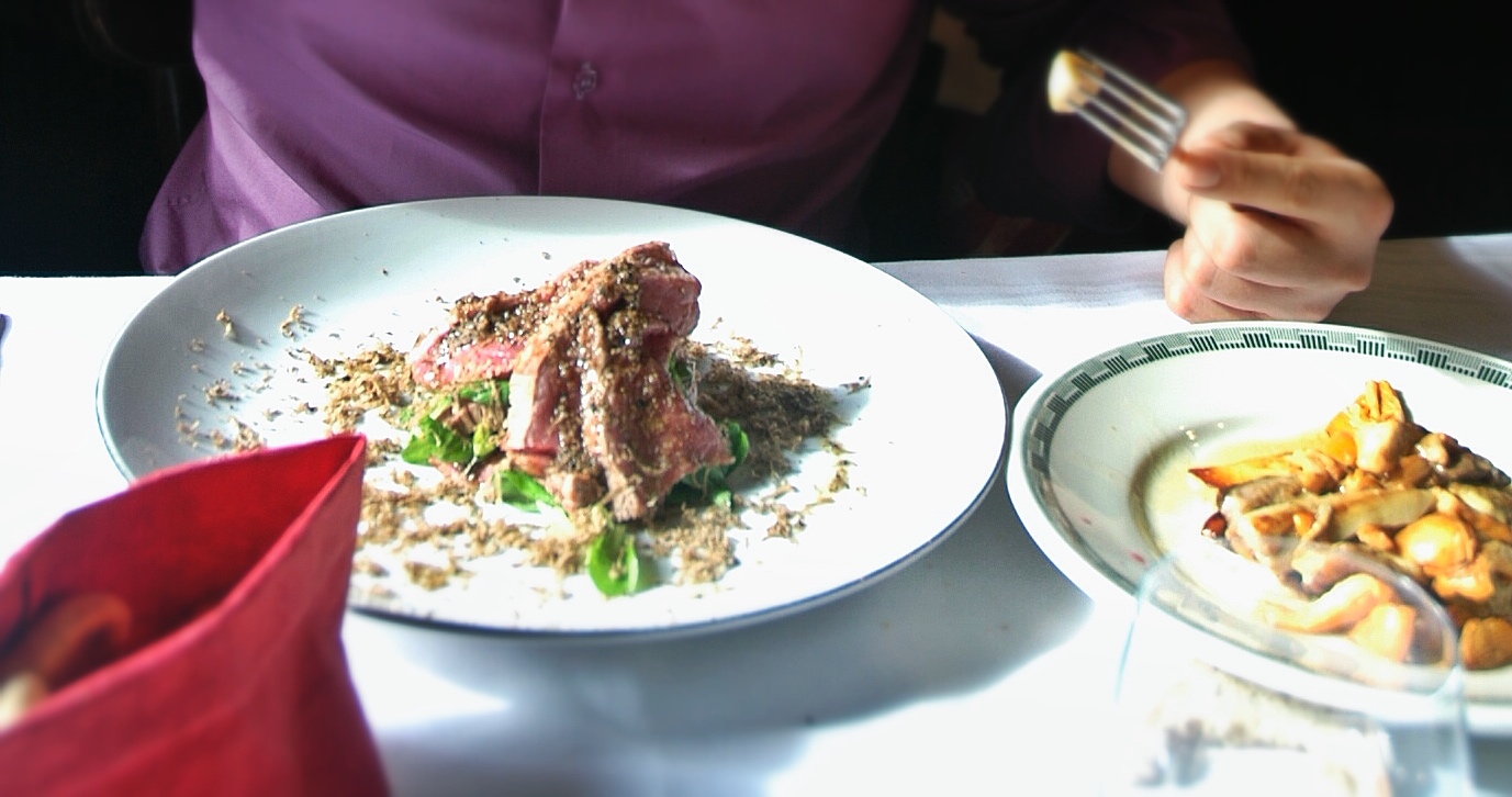 e um contrafilé com misto de funghi, valeriana (uma saladinha) e tartufo bianco.