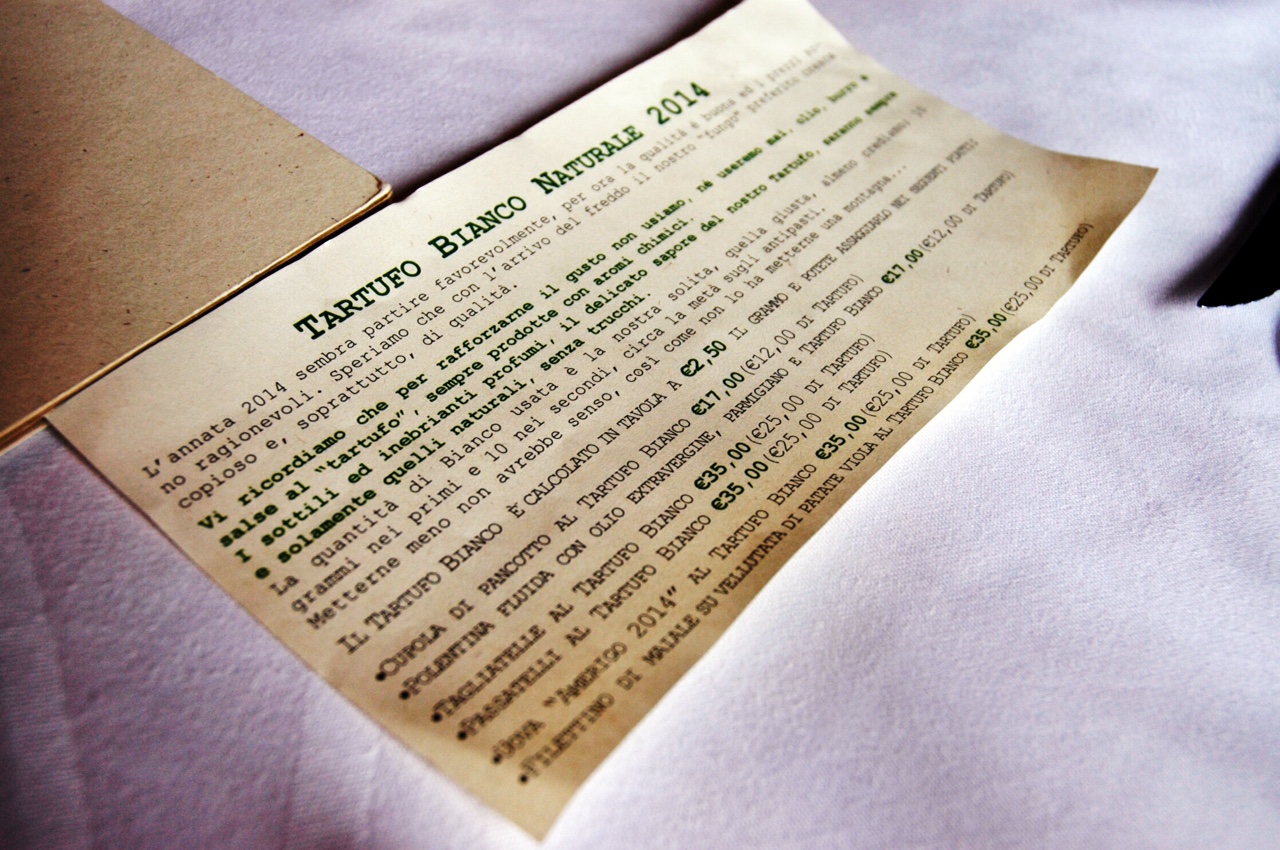 Mas, ir nesta época é ainda mais mágico: há também o menu “Tartufo Bianco Naturale”, um pequeno folheto que oferece, além de pratos feitos com esse ingrediente, explicações muito interessantes:
