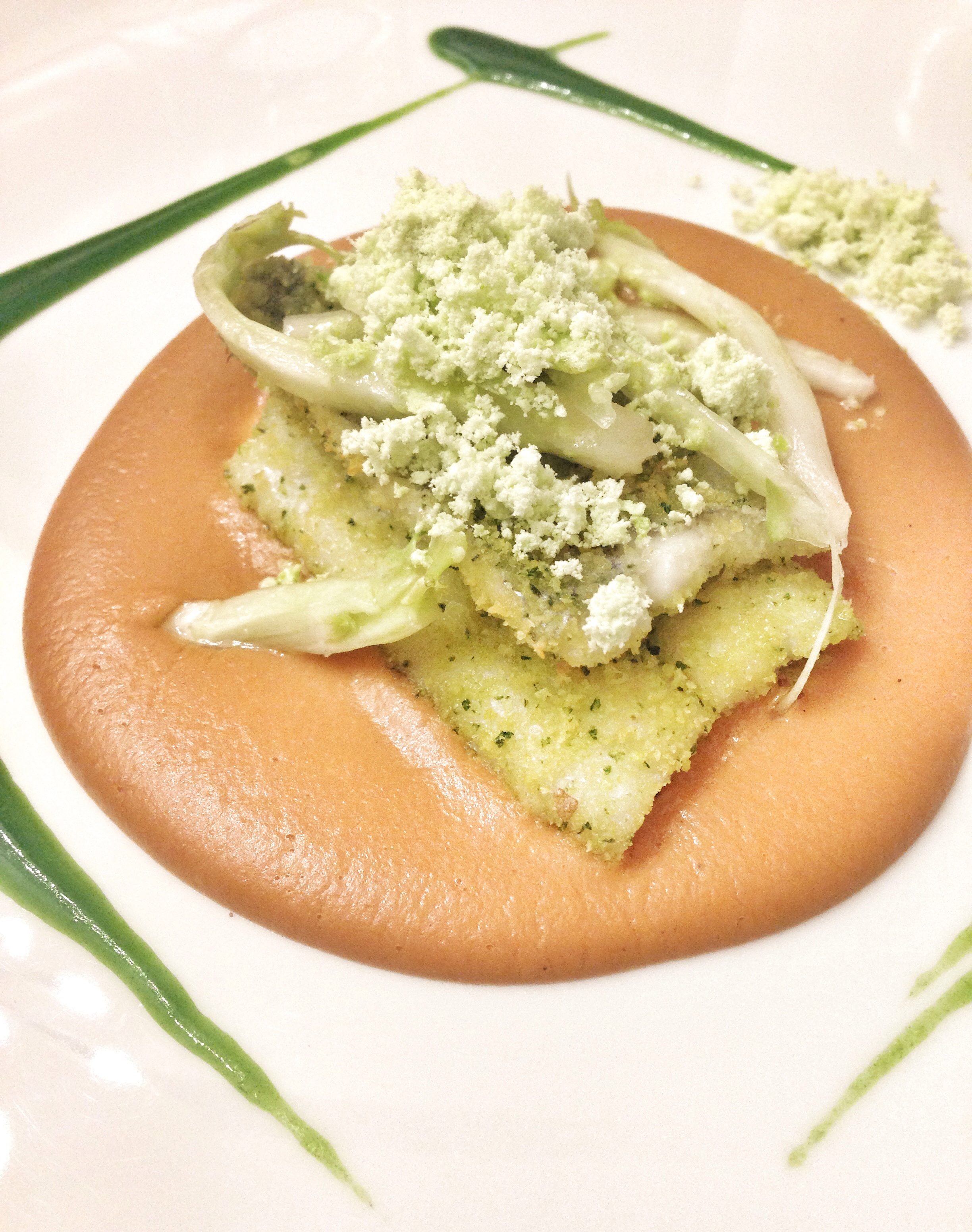As fotos são de alguns dos destaques dos 5 pratos (mais sobremesa) que o chef nos presenteou. A primeira do post era um Peixe “spatola” – que é tipo um agulhão, com puntarelle e creme de feijão. Aqui embaixo o doce: