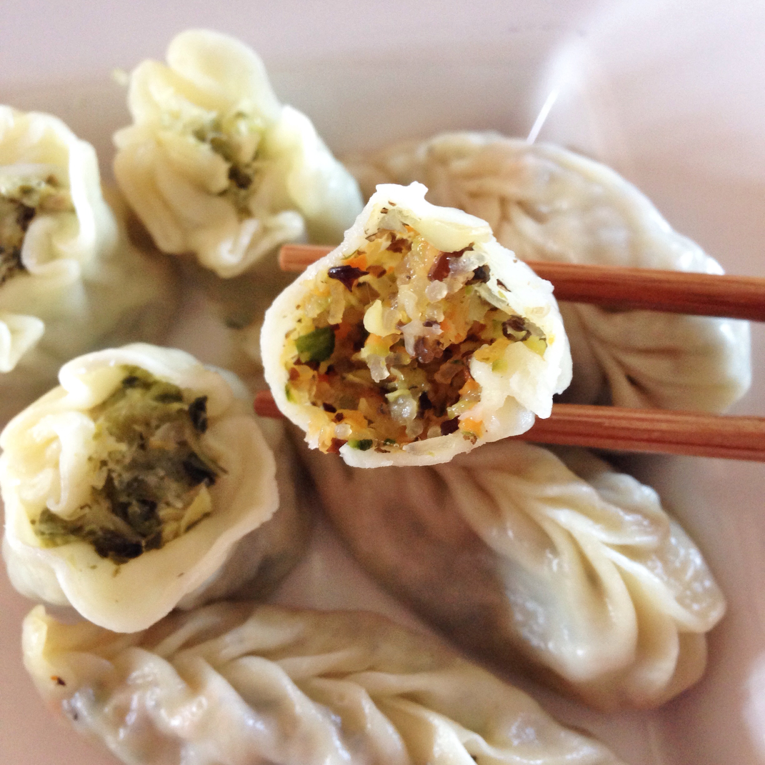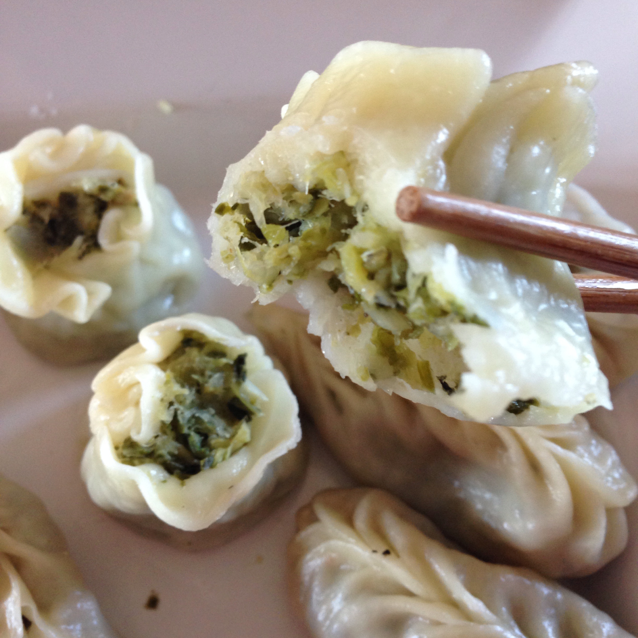Minhas escolhas, aquele dia, foram um dumpling de verduras e um siu mai de bacalhau e acelga. Tudo levinho e delicioso!
