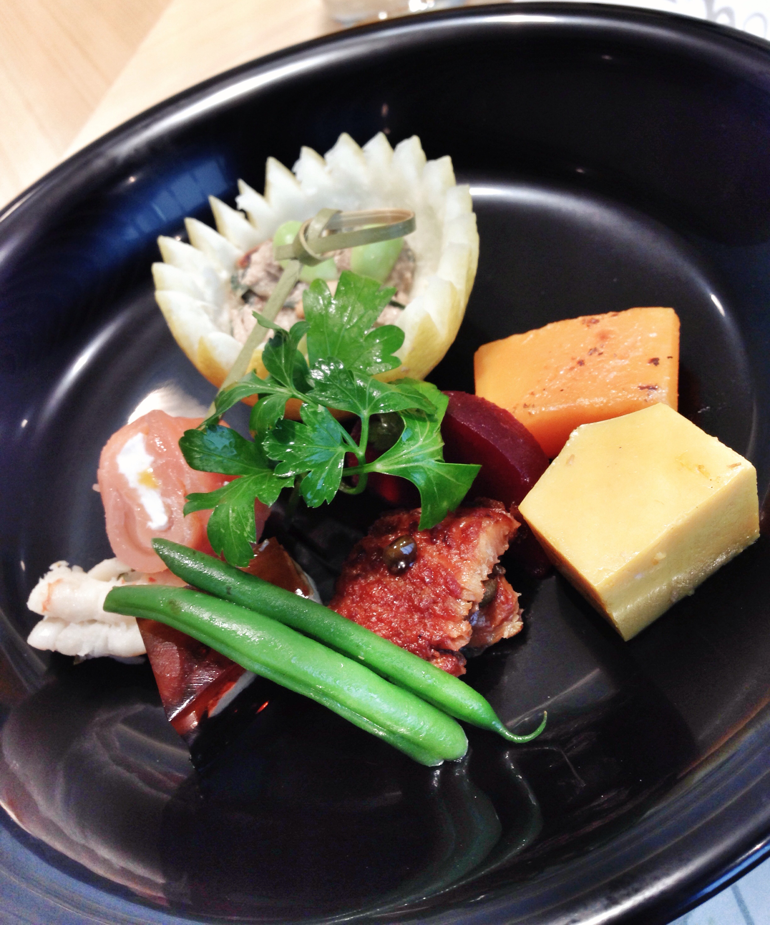 E, mal chega minha Kirin Ichiban– sim, a menina estranha que come sozinha toma cerveja – o primeiro prato é delicadamente colocado na minha frente. “Zenzai”, o antepasto, com enguia cozida com pimenta-do-reino verde japonesa, rolinho de salmão e queijo cremoso, camarão grelhado, “foie gras gelatina” à la japonesa, omelete japonês e verduras temperadas com pasta de nozes. À primeira mordida, uma certeza – e um certo alívio –: estava no lugar certo e aquela refeição valeria cada centavo.