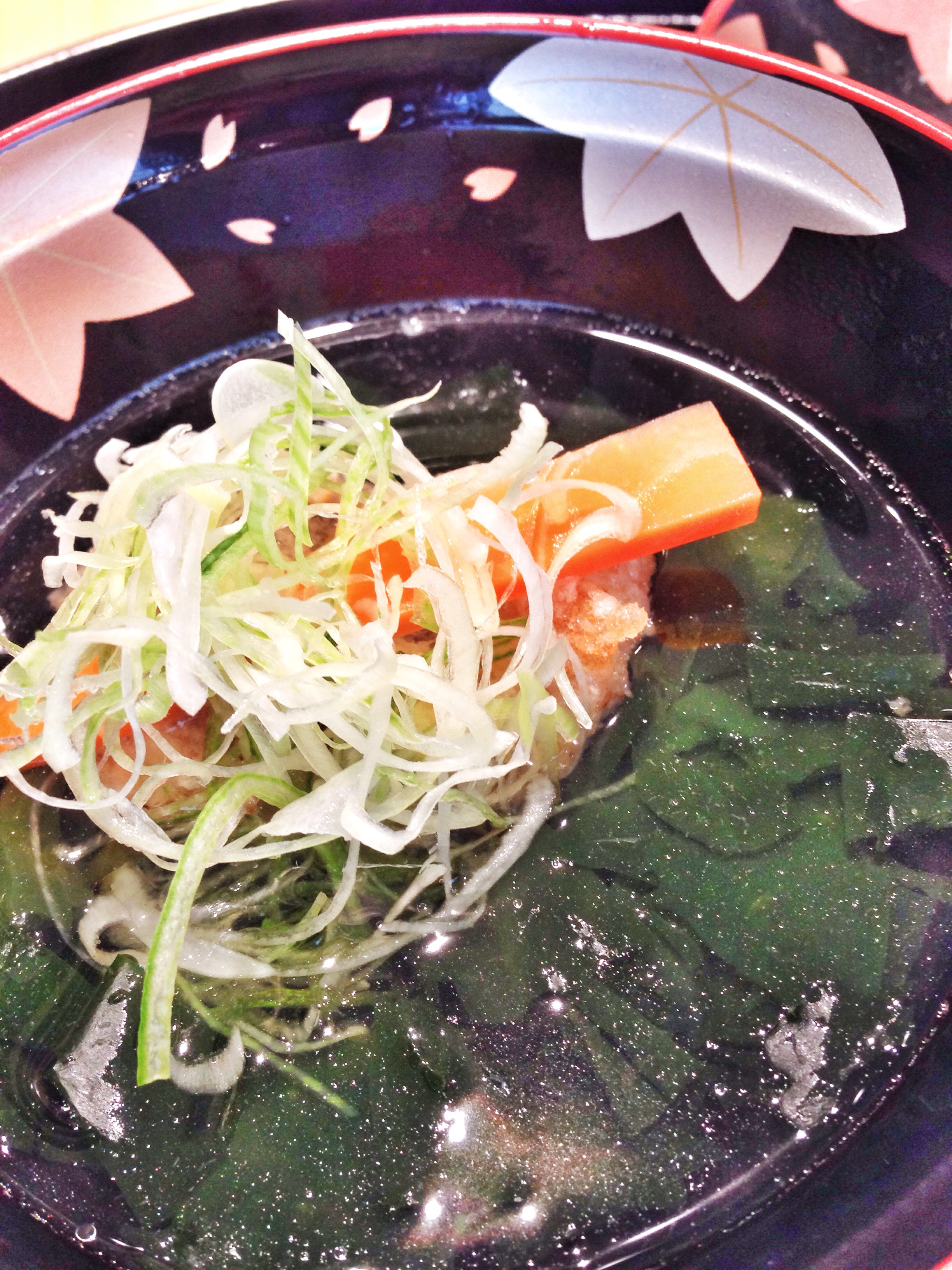 Depois, “Wanmono”, sopa. Aquela era de dashi – caldo de alga kombu e peixe seco – com um pedação de pargo frito dentro, cenoura, alga wakamame, gengibre e alho porró. É impressionante como uma coisa tão límpida e inocente pode conter tanta potência. Como dizia o sábio, de levantar defunto!