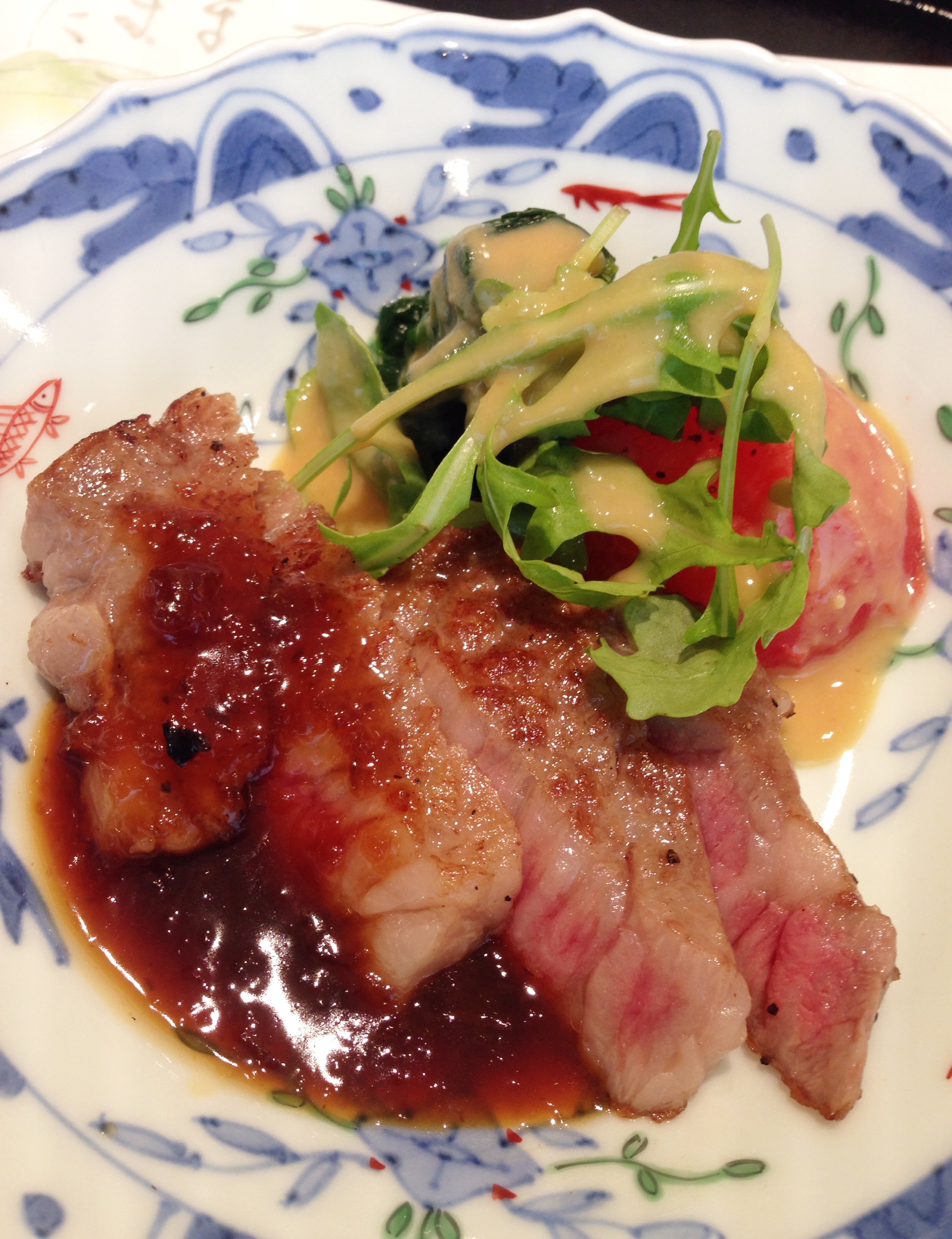Eis que chega, então, o melhor prato da degustação: bife de carne japonesa grelhada com molho teriyaki da casa, acompanhada de verduras e tomate grelhado com molho de missô.